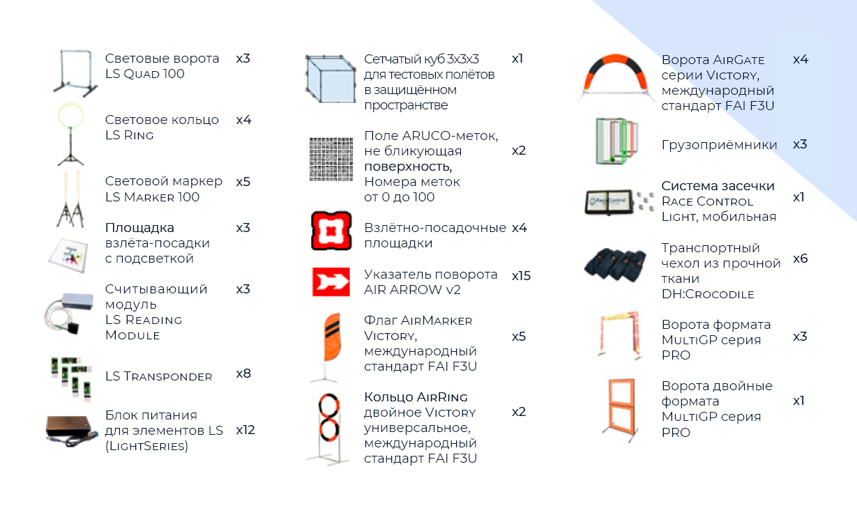 Утвержденный комплект элементов трасс для проведения инженерно-спортивных соревнований, чемпионатов, и реализации учебных программ технических центров, образовательных организаций и Кванториумов по компетенции “Эксплуатация БАС”.