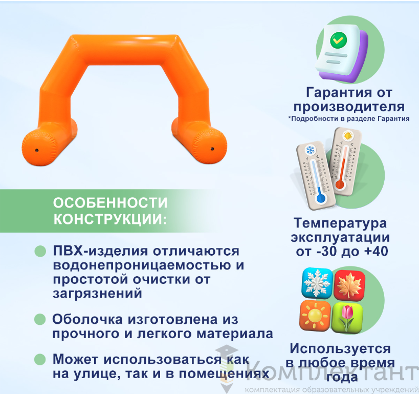 Надувная арка выполнена из армированного ПВХ с плотностью 750–850 г/м². Материал устойчив к истиранию, механическим нагрузкам и погодным условиям. Конструкция сохраняет форму в течение всего мероприятия, не теряя визуальной читаемости при сильном ветре или освещении.