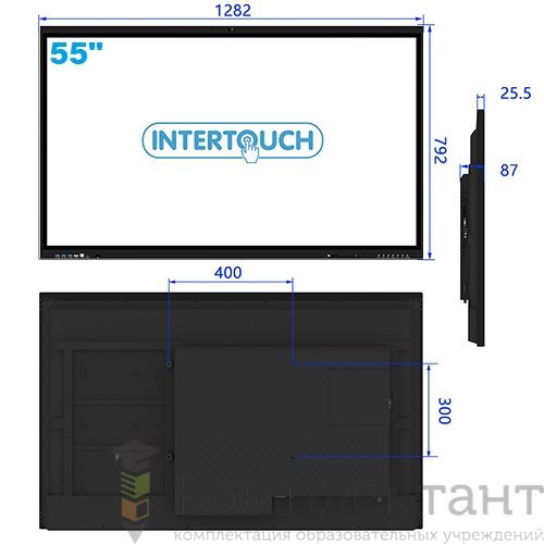 Интерактивная панель серия СТ с диагональю 55 с одним встроенным вычислительным блоком 8/512 Гб, закаленным стеклом, антибликовым покрытием, камерой 5 Мп, микрофонами 8 шт, датчиком освещенности.