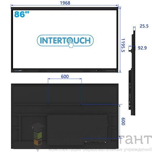 Интерактивная панель серия СТ с диагональю 86 с одним встроенным вычислительным блоком 8/512 Гб, закаленным стеклом, антибликовым покрытием, камерой 5 Мп, микрофонами 8 шт, датчиком освещенности.