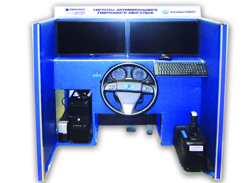 Комплект учебно-демонстрационного оборудования для изучения современного автомобиля с гибридным двигателем выполнен в напольном исполнении и представляет собой рабочее место для бригады студентов из двух человек. Комплект содержит реальные элементы автомобиля, такие как приборная панель, блок рулевого управления, блок педалей тормоза и акселератора, селектор выбора режима работы.