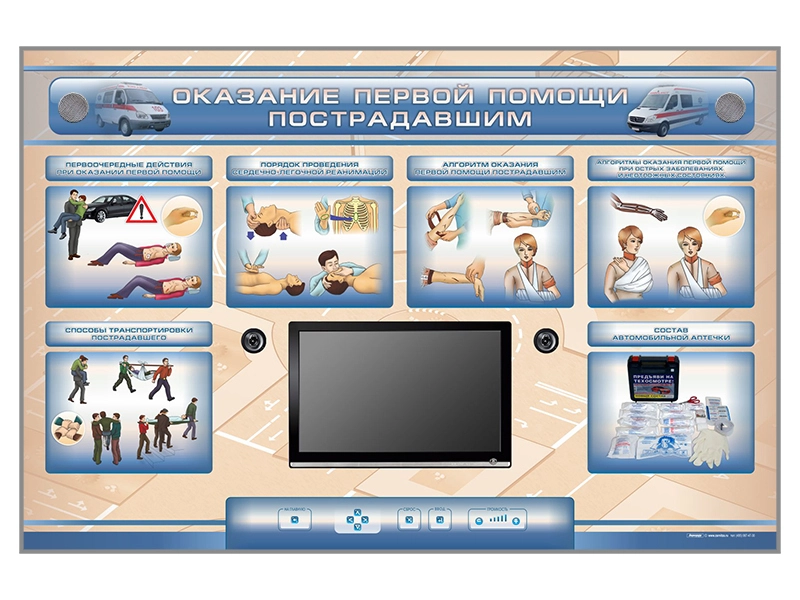 Многофункциональный интерактивный стенд-тренажер представляет собой информационную панель с раздельной секционной световой индикацией. На стенде-тренажере размещены секции с названиями основных разделов по теме "Оказание первой помощи пострадавшим". В конструкцию учебного оборудования интегрирован ЖК-дисплей 19", на котором отображается обучающий материал.