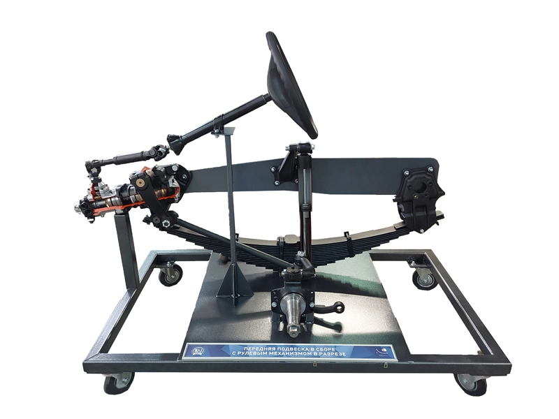 Стенд представляет собой оригинальную комплектную переднюю подвеску в сборе с рулевым механизмом в разрезе, серийно устанавливаемую на грузовые автомобили марки КАМАЗ. Размещен на подставке напольного исполнения, покрытой защитной порошковой эмалью и оснащенной четырьмя подвижными колесами с фиксаторами.