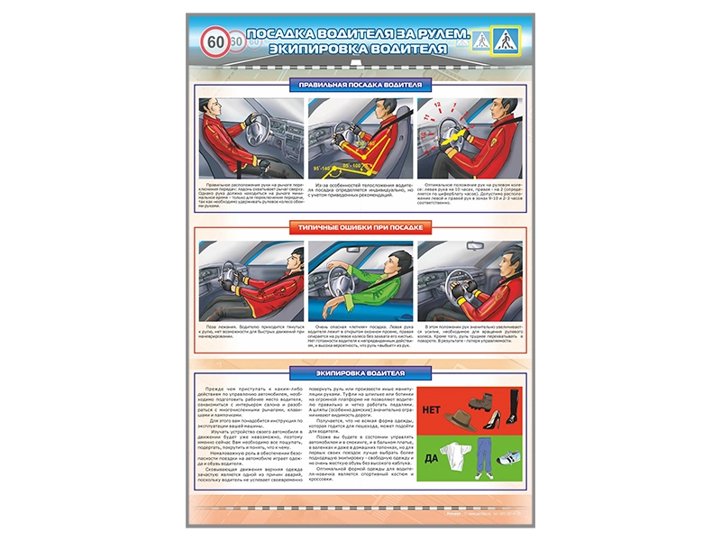 Стенд представляет собой информационную панель, на которой размещены сведения о посадке водителя за рулем и его экипировке (для категории "B", "С", "D").