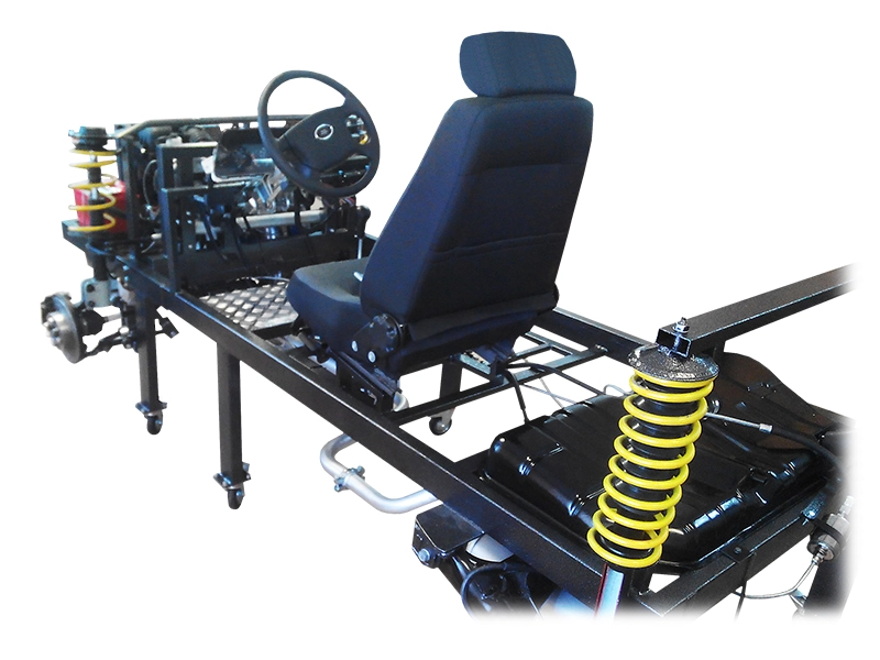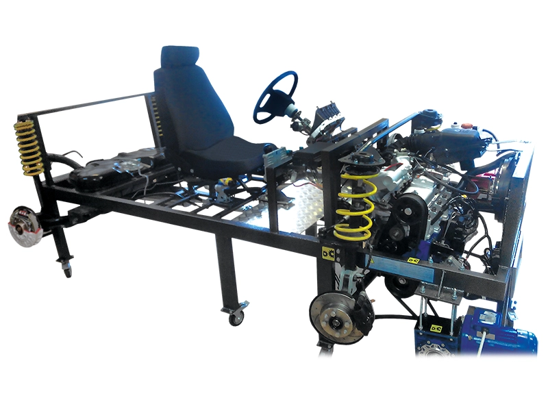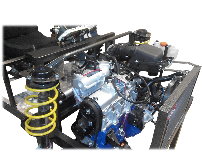Стенд предназначен для проведения комплекса теоретических, практических и лабораторных работ по изучению конструкции шасси переднеприводного автомобиля, для закрепления навыков обучающихся по курсам: "Устройство автомобильной техники", "Конструкция и расчет автомобильной техники"; для наглядной демонстрации шасси переднеприводного автомобиля, а также для формирования у учащихся автошкол знаний об устройстве транспортных средств категории "В".