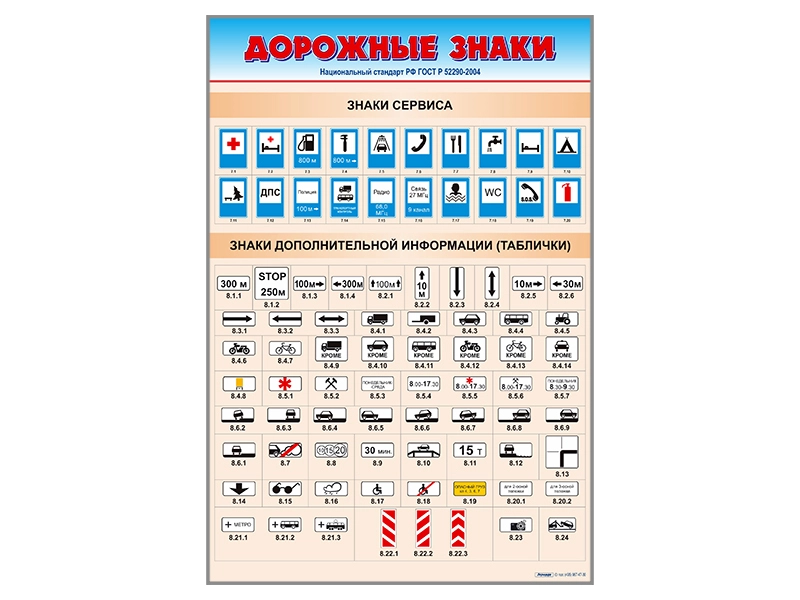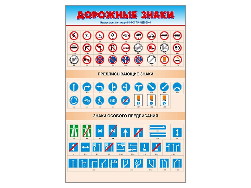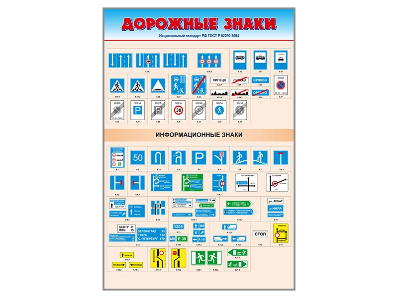 Стенды представляют собой информационные панели, на которых изображены дорожные знаки согласно ГОСТу Р 52290-2004.