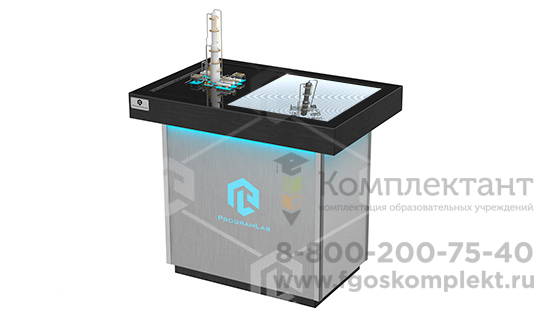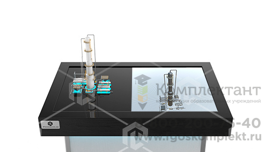 Стационарный интерактивный макет на мобильной платформе позволяет изучать последовательность и логистику технологических процессов установки вторичной перегонки бензина с возможностью сенсорного ввода и управления, отображать трехмерные разрезы выбранного элемента оборудования на дисплее макета.