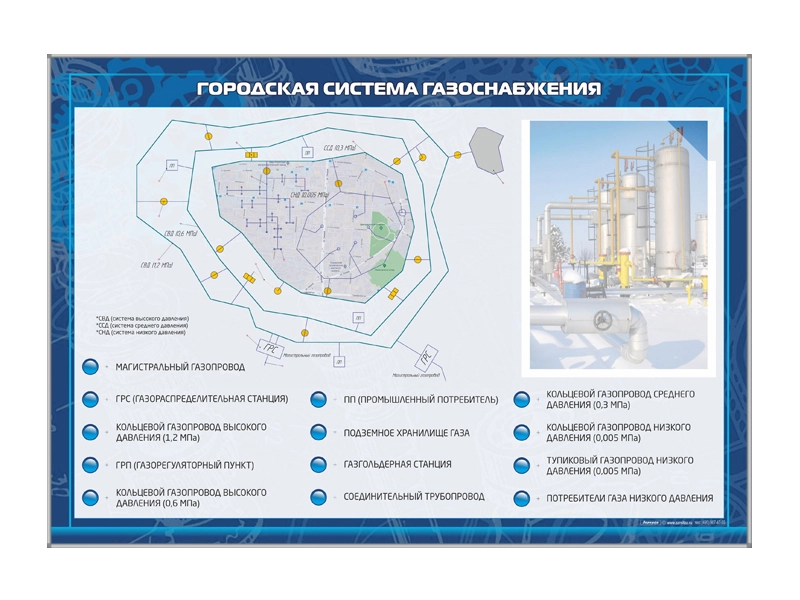 Стенд-планшет предназначен для изучения сложного комплекса сооружений, технических устройств и трубопроводов, обеспечивающих подачу и распределение газа между промышленными, коммунальными и бытовыми потребителями в соответствии с их спросом.