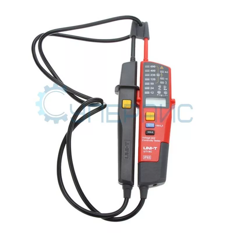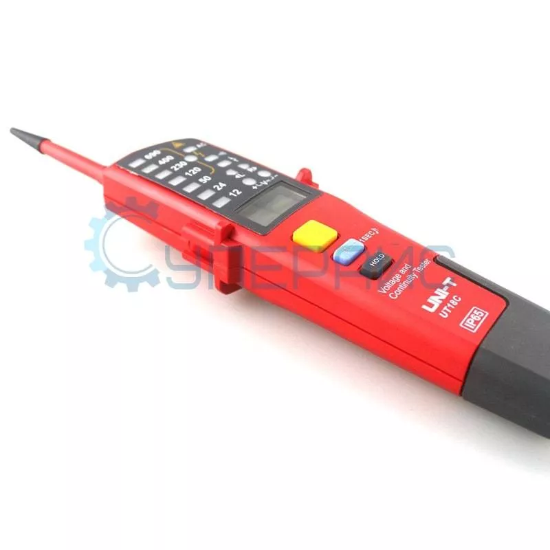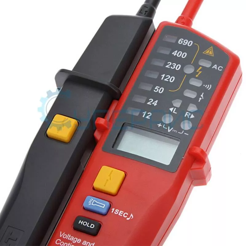 С детектором напряжения UNI-T UT18C Вы сможете определить наличие или отсутствие напряжения в сети, измерить постоянный и переменный ток, фазировку трехфазового переменного тока, частоту, а также проводить тесты на целостность цепи и проверку корректного подключения устройств защитного отключения с помощью одного единственного прибора. Прибор имеет возможность работы с трехфазными цепями и позволяет производить простые измерения в случае севшей батареи или ее отсутствия. Данный детектор напряжения производит измерение одним щупом и может указать только наличие или отсутствие напряжение на проверяемом объекте. Имеет степень защиты IP65, соответствует мировым стандартам безопасности и качества. Еще одно удобство – встроенный фонарик для подсветки, который может использоваться при необходимости работы прибора ночью или в темноте. Индикатор напряжения UNI-T UT18C имеет индикацию напряжения светодиодами до 690 В и индикацию полярности. Для удобства считывания результаты замеров (напряжение и частота) можно задержать, кратко нажав кнопку HOLD на приборе после измерения.