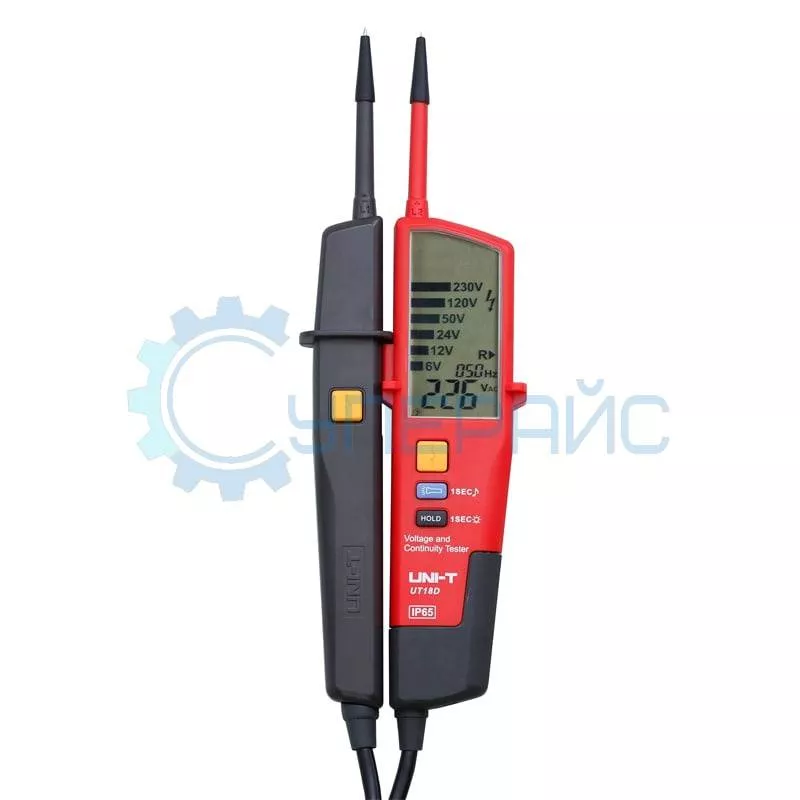 UNI-T UT18D — высококачественный тестер напряжения промышленного класса, оснащенный функцией измерения напряжения, частоты, последовательности фаз для трехфазной системы переменного тока, тестирования автоматов УЗО, самопроверки, прозвонки цепи, тестирования напряжения одним щупом. Прибор работает как с постоянным, так и с переменным напряжением. Результаты измерений выводятся на ЖК-дисплей с подсветкой, что позволяет производить измерения при плохом освещении или в темное время суток. Для включения подсветки на ЖК индикаторе следует нажать и удерживать в течение 1 секунды кнопку HOLD. Для удобства считывания результаты замеров (напряжение и частота) можно задержать, кратко нажав кнопку HOLD на приборе после измерения. В процессе работы, тестер напряжения UT18D автоматически определяет и подбирает необходимые настройки: вы можете сразу приступать к измерению без всяких включений и переключений. Прибор имеет возможность работы с трехфазными цепями и позволяет производить простые измерения в случае севшей батареи или ее отсутствия. Индикатор напряжения удобно лежит в руке, прост в применении, допускает работу в перчатках и обеспечивает быструю и надежную фиксацию щупов.