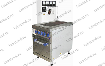 Действующая электроплита типа ЭП2ЖШ с размещенными на вертикальной панели приборами для измерения температуры обрабатываемых продуктов, конфорки, духового шкафа, тока, напряжения, расхода электроэнергии.