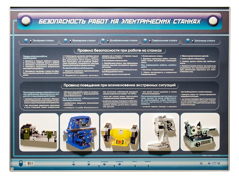 Интерактивный электрифицированный стенд предназначен для изучения правил безопасности при работе на металлообрабатывающих станках и особенностей различных групп оборудования.