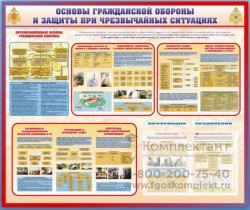 Стенд представляет собой панель, на которой размещена информация о разных аспектах основ гражданской обороны.