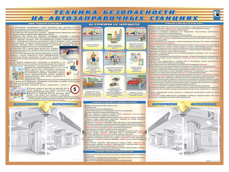 Предназначен для наглядного отображения информации об обеспечении общих мер безопасности во время рабочего процесса и по окончании работ, условиях допуска к работе, правилах поведения и порядке действий при опасных ситуациях в условиях автозаправочных станций, а также для формирования у сотрудников осознанного отношения к запрещённым действиям на территории АЗС.