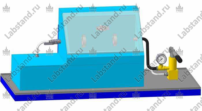 Стенд позволяет определять давление разрушения полипропиленовых труб и арматуры диаметров 20, 25 и 32 мм. Стенд представляет собой камеру с прозрачной открывающейся дверью, в которую устанавливается исследуемый участок трубопровода. На концы исследуемого участка надеваются переходные детали с уплотнениями, фиксируемые на каркасе внутри камеры. Давление в трубопроводе создается ручным насосом и контролируется датчиком давления с индикацией. Блок индикации запоминает и отображает максимальное давление перед разрушением. Исследуемый участок должен быть спаян учащимися перед проведением испытаний.