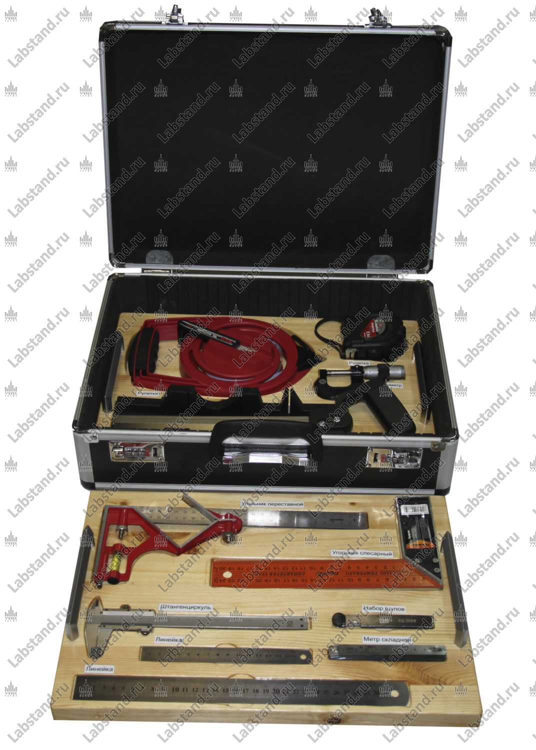 Набор стандартных инструментов и приборов для определения и разметки длин и углов, применяемые в строительстве, такие как: штангенциркуль, угольник переставной, угольник слесарный, линейки металлические, микрометр, метр складной, рулетки, усорез (стусло), набор щупов.