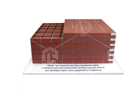 - Макет трехрядной системы перевязки швов с поперечным армированием прямоугольной сеткой (на примере простенка шириной в 2 кирпича)