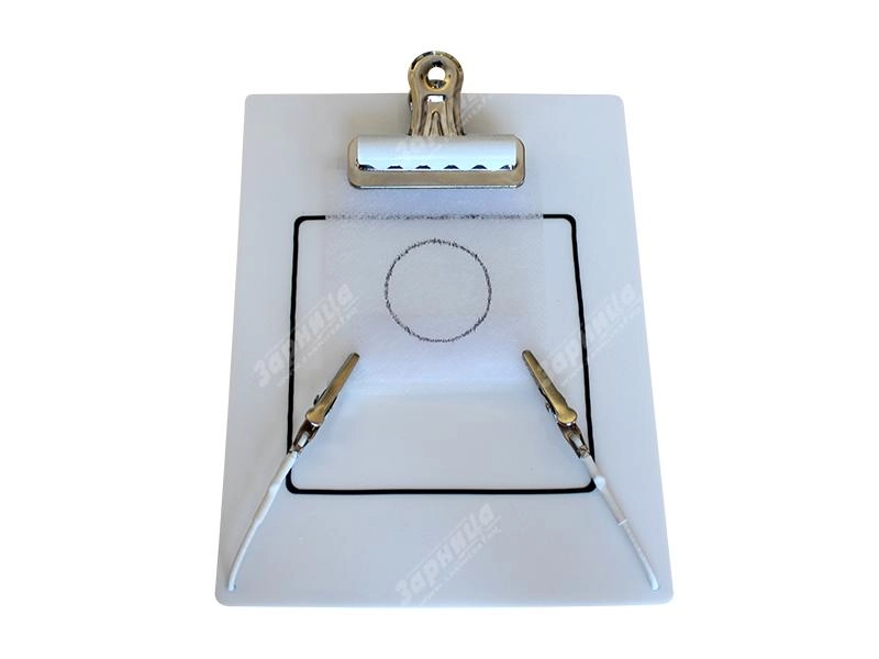 Данное пособие представляет собой матерчатую салфетку, закрепленную в держателе, с нанесенным на ней кругом в виде черной нити. Тестируемый должен отсекать часть салфетки, расположенную внутри круга, не выходя за его пределы.