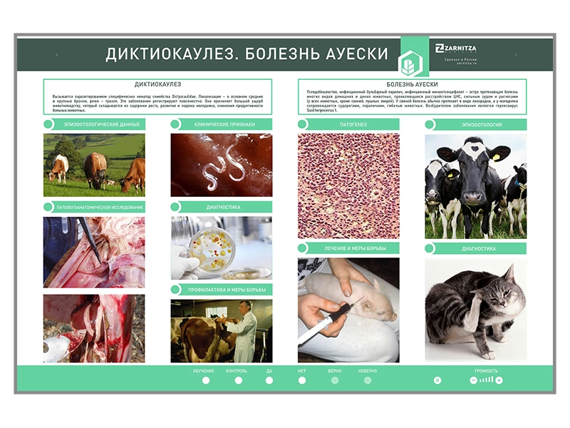 Электрифицированный стенд "Диктиокаулез. Болезнь Ауески" представляет собой полноцветную светодинамическую панель, на которой отображена информация о заболеваниях животных, вызванных паразитами, - диктиокаулезе и болезни Ауески.