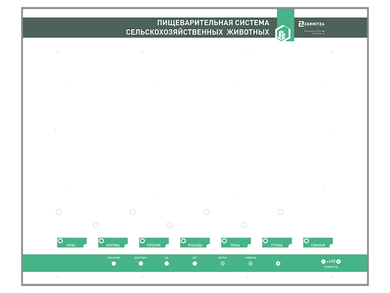 В зависимости от изучаемого животного выбирается соответствующая быстросъемная панель, которая накладывается на лицевую часть стенда. Панели хранятся на специальном элементе крепления, расположенном в нижней части стенда, для удобства выбора и замены. Установка панели осуществляется одним человеком в течение 10-15 секунд. Далее при помощи элемента управления выбирается режим работы и наименование панели, которая установлена. В режиме "Обучение" при помощи элемента управления выбирается любой из представленных органов системы пищеварения животного. Выбранный пункт отмечается светодиодной подсветкой и сопровождается подробным голосовым описанием "Виртуального учителя". В режиме "Контроль" программный код управления генерирует случайный вариант вопроса. При правильном или неправильном выборе ответа загорается соответствующая принятым стандартам светодиодная индикация. Громкость "Виртуального учителя" изменяется при помощи сенсорного регулятора, расположенного на лицевой стороне стенда.