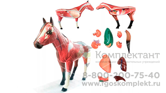 Интерактивный учебный комплекс предназначен для подготовки специалистов ветеринарного профиля и позволяет отработать общие вопросы внешнего и внутреннего анатомического строения лошади, а также строение внутренних органов и их расположение. Стенд представляет из себя модель лошади из пластика, установленную на скрытом металлическом основании в уменьшенном масштабе. Внутренние органы лошади, выполненные из пластика, могут быть закреплены внутри туловища на магнитные держатели. Макет оснащен подсветкой и магнитными датчиками на каждом из органов, при поднесении специализированной указки начинается воспроизведение звукового фрагмента с описанием строения данного органа на русском языке.