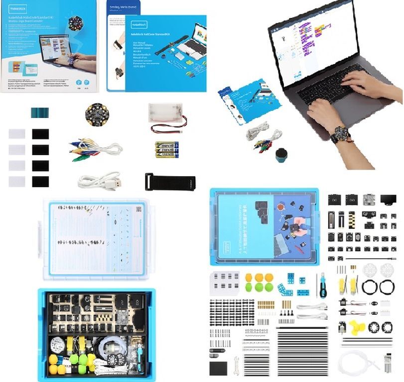 Набор позволяет для построения двух кибернетических систем. В наборе содержатся два беспроводных одноплатных контроллера с широкими возможностями для обучения программированию и технологиям IoT (интернет вещей) и AI (искусственный интеллект). Совместимые с ними электронные модули с последовательным соединением расширяют проектные возможности обучения. Программирование осуществляется в среде mBlock на языках Scratсh и Python. Данные модули позволяют также создавать проекты без внешнего программирования. Игровой набор для обучения программированию детей, для создания робототехнических проектов (например «Умный дом»). В основе набора беспроводной программируемый контроллер с программируемыми модулями (RGB-светодиодами, гироскопом, микрофоном, кнопкой и тд). Программирование осуществляется на ПК в бесплатно скачиваемом ПО mBlock 5, основанном на визуальном языке Scratch3.0. Программа загружается кабелем USB. Питание контроллера от батареек 3 ААА. В наборе содержатся аксессуары для контроллера - ремешок для создания часов, зажимы «крокодил» и т/д.; Наиболее полный ресурсный набор к программируемому в Arduino-подобной среде контроллеру Makeblock Halocode (нет в составе) для изучение основ искусственного интеллекта и интернета вещей, содержащий 31 электронный модуль mBuild и 10 типов дополнительных элементов к ним. С помощью набора обучающиеся могут изучать ИИ, интернет вещей, применять технологии в повседневной жизни и выполнять увлекательные проекты с помощью датчиков и визуального программирования. Модули программируются как на визуальном языке, так и на Python. В составе набора модуль SMART Camera, для изучения и реализации проектов цифрового зрения роботов. Конструктивно модули совместимы с Makeblock и Lego.В набор входит: