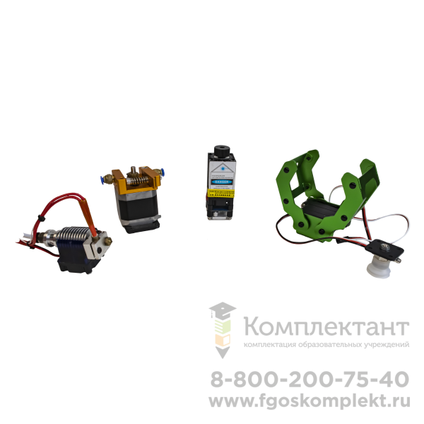 Ресурсный набор для расширения возможностей изучения манипуляторной робототехники. Набор включает в себя пневмоприсоску способную удерживать груз не менее 450г, модуль 3d принтера с диаметром сопла 1мм, модуль для изучения технологии лазерной гравировки и резки.