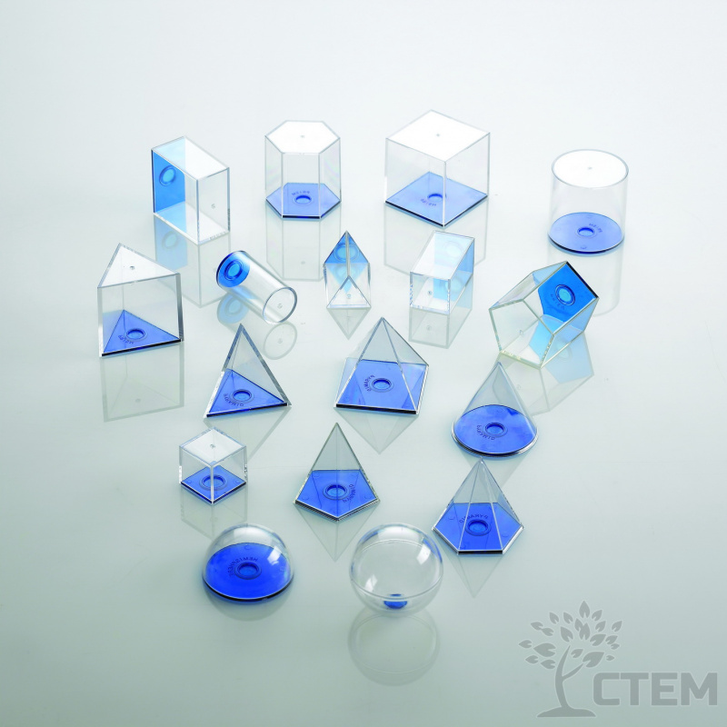 Набор включают в себя 17 разных геометрических фигур. Геометрические фигуры выполнены из прозрачного пластика с цветными съемными крышечками-основанием.