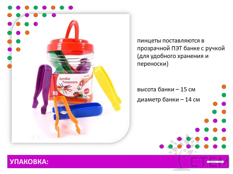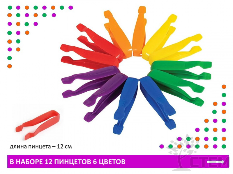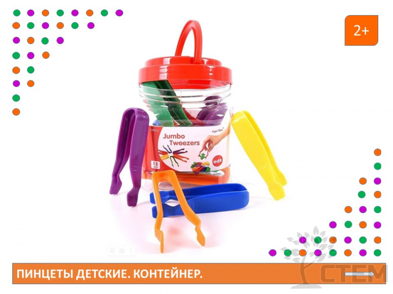 совершенствуют мелкую моторику. В наборе 12 пинцетов 6 цветов. Длинна пинцетов 12см. Пинцеты поставляются в прозрачной ПЭТ банке с ручкой (высотой 15 см, диаметром 14см).