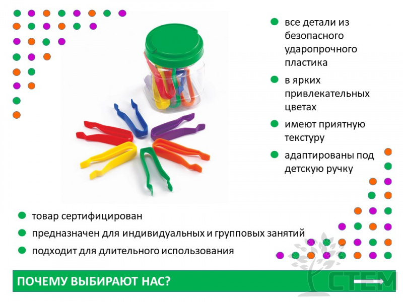 Красочные пинцеты отлично подходят для игр со счетом и сортировкой. Удобны для маленьких рук,