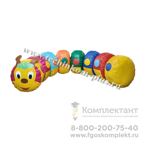 Гусеница состоитиз 8 частей-пуфиков d-50 h-28 см. Яркиемодули-пуфы соединяются между собой липучками, их можно собирать в произвольнойлибо заданном порядке.