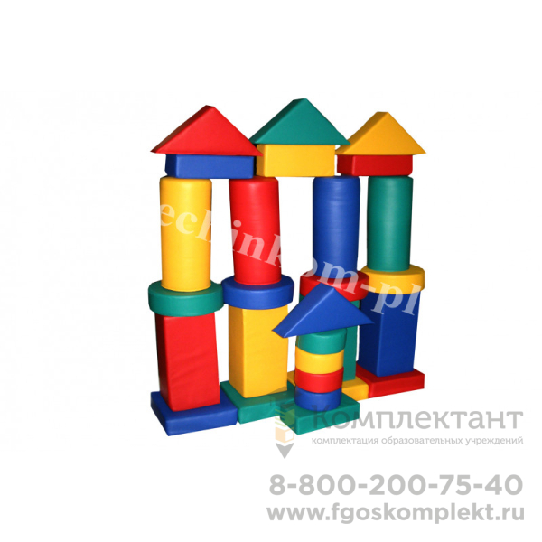 Состав набора: Цилиндр Н=50 см, ф=20 см-4 шт., Брусок 50х20х20 см-4 шт, Пуф ф=30, Н=10 см-4 шт., пуф ф=20 см, Н=10 см-4 шт.,брусок 30х10х15 см-4 шт.,папка 30х30х10 см-4 шт., треугольник 30х30 см, Н=10 см — 4 шт.