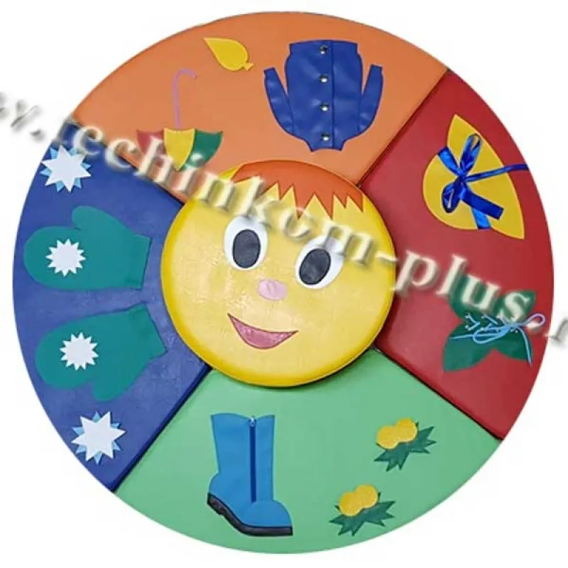Набор дидактических модулей «Времена года» представляет собой пуфик с 4-мя секторами вокруг, которые крепятся друг к другу и к пуфу с помощью липучки. На каждый элемент нанесены аппликации в виде одежды , соответствующие каждому сезону. Секторы снабжены обучающей фурнитурой и съемными элементами.