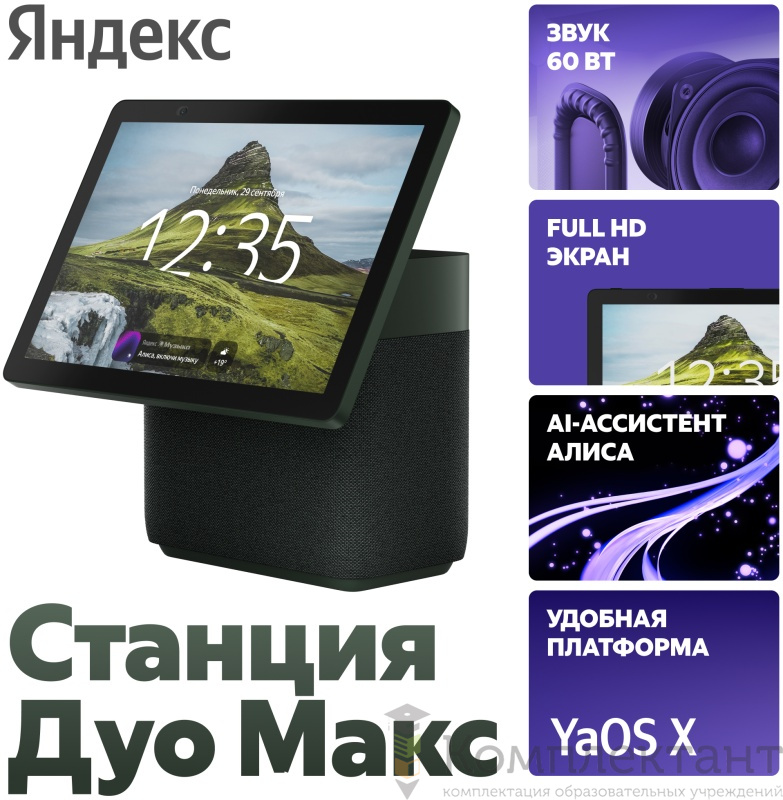 Яндекс Станция Дуо Макс — флагманская умная колонка с AI-ассистентом Алисой, операционной системой YaOS X, большим поворотным Full HD touch-экраном с камерой, мощными динамиками и сабвуфером. Смотрите и слушайте что любите, делегируйте домашние и рабочие задачи, управляйте умным домом голосом или касаниями.