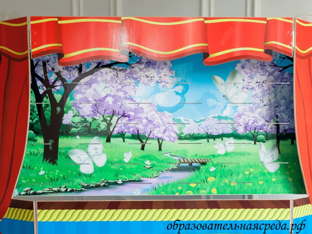 Двухсторонний экран для кукольного театра осень-весна можно приобрести в дополнение к напольному кукольному театру. Экран имеет отверстия которые позволяют актеру наблюдать за своими куклами и зрителями при показе представления. С одной стороны, на экране изображен весенний пейзаж с цветущими деревьями и бабочками, а на другой стороне осенний лес.