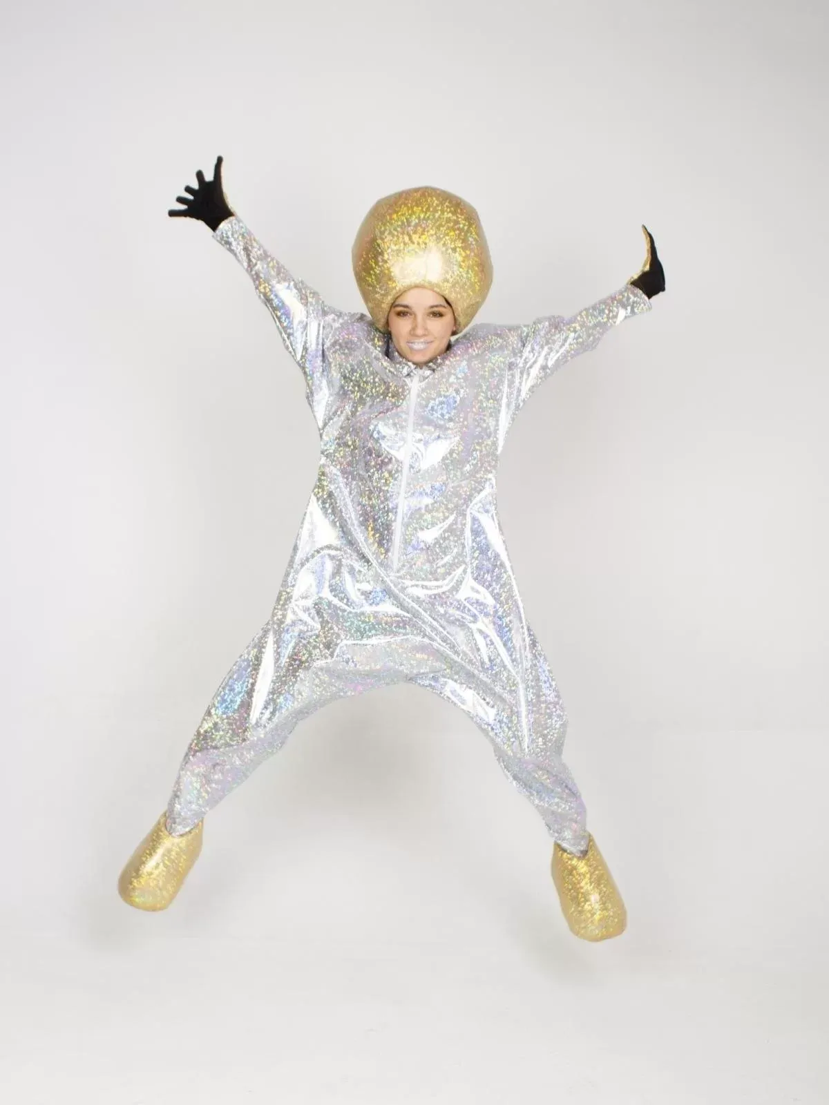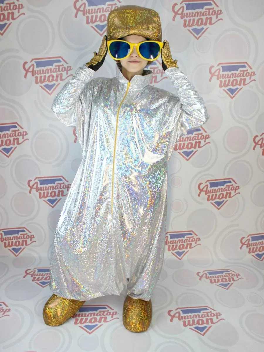 Костюм Слайм выполнен из яркой голограммы золотого и серебряного цвета, переливающейся на свету, как мыльный пузырь или диско-шар.
