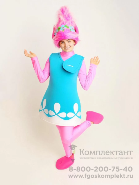 Розочка – тролль, дочь бесстрашного отца, Розового короля, ее сердце наполнено смелостью, уверенностью, оптимизмом. Она настолько очаровательна и мила, что влюбляет в себя с первых минут появления. Костюм Тролля Розочка полностью отражает мультипликационный персонаж. На выбор предоставляется 2 варианта головного убора – мехом вниз и мехом наверх.