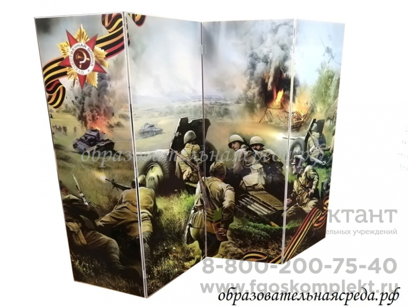 Ширма двухсторонняя, на второй стороне изображена тематическая декорация "Военные".