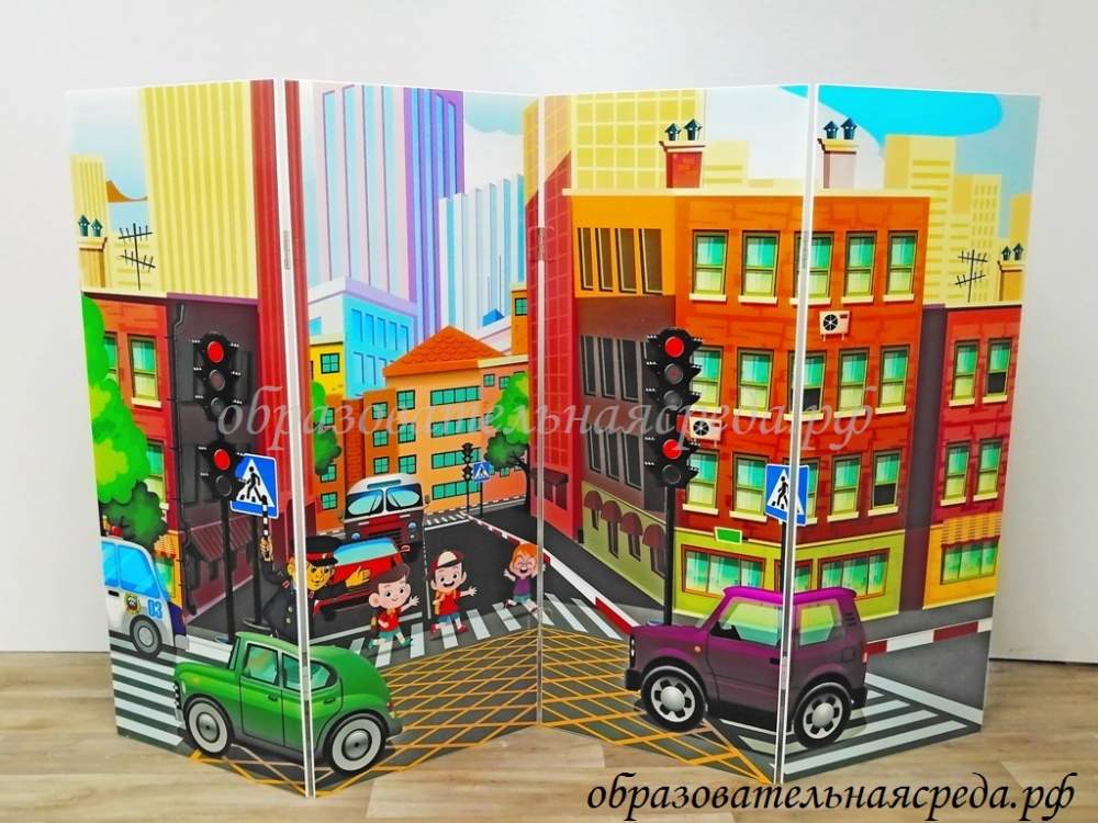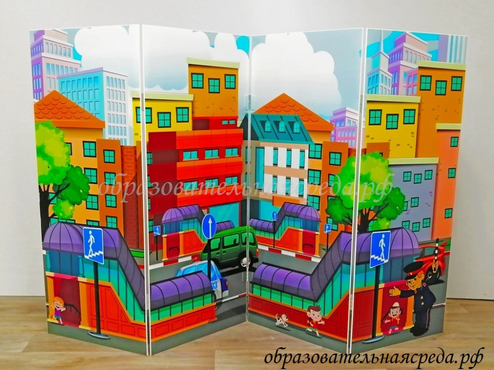Напольная ширма гармошка "Городская среда" выполнена из МДФ с нанесением полноцветного рисунка с двух сторон ширмы. С обеих сторон ширмы изображена панорама города. Ширма состоит из четырех створок, скрепленных между собой на петлях. Для удобства в эксплуатации ширма складывается гармошкой и при хранении занимает мало места.