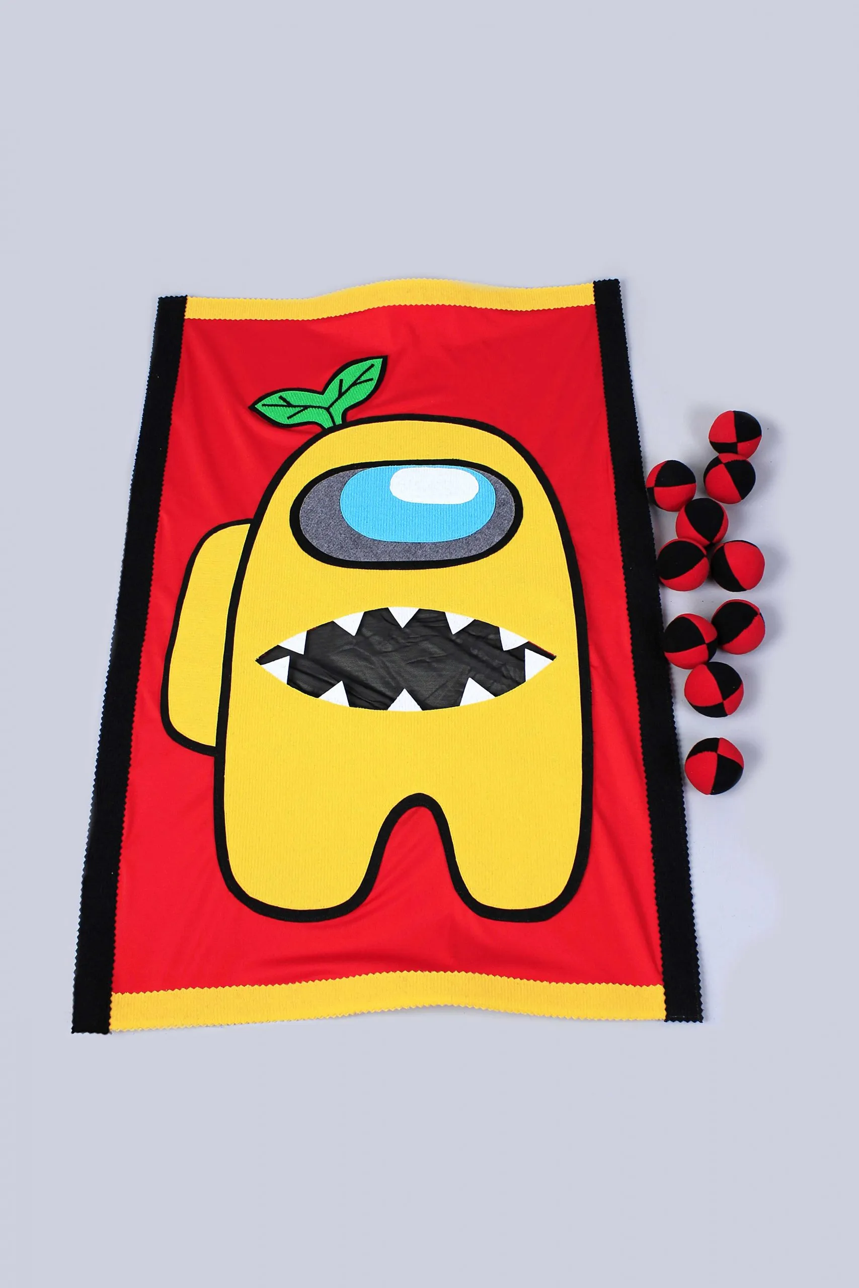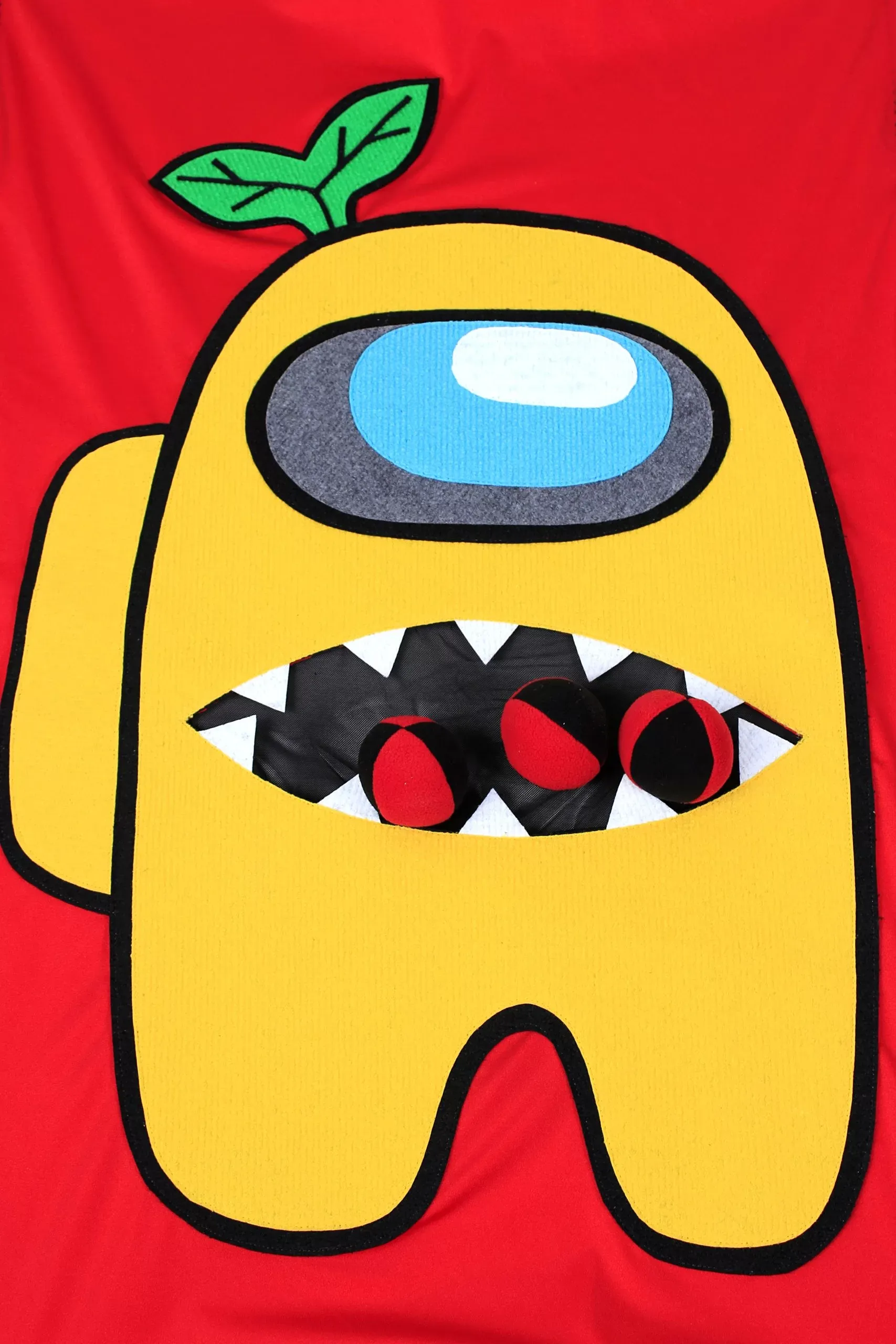 Эстафетный вариант игры. Выдаем каждому ребенку по мячику и организуем детей в 2 команды (для этого лучше иметь 2 растяжки). Каждый участник по очереди подбегает к Амонгу и кладет свой мячик в карман. Побеждают те, кто быстрее накормят героя 10-ю мячиками.