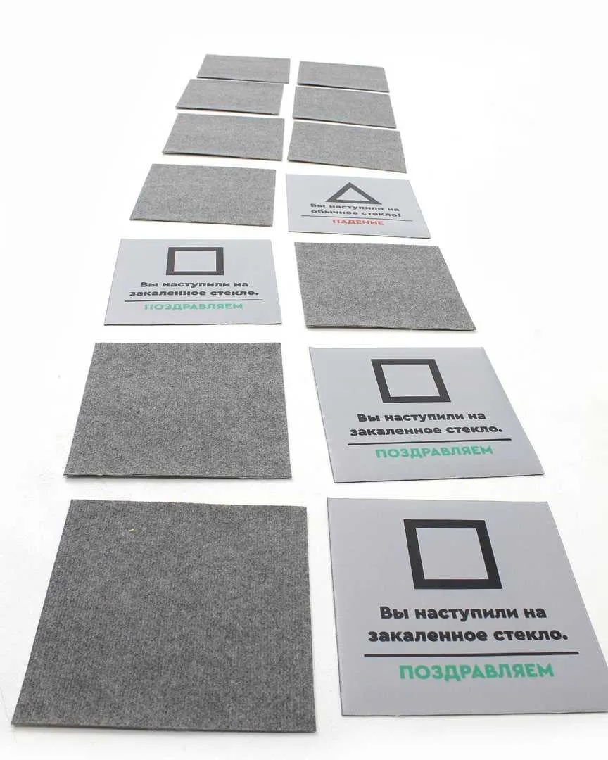 Переворачиваем островки изображением вниз. По очереди наступаем на островки и нужно пройти до конца, наступая на островки “закаленное стекло”. Если наступил на “обычное стекло” – выбываешь.