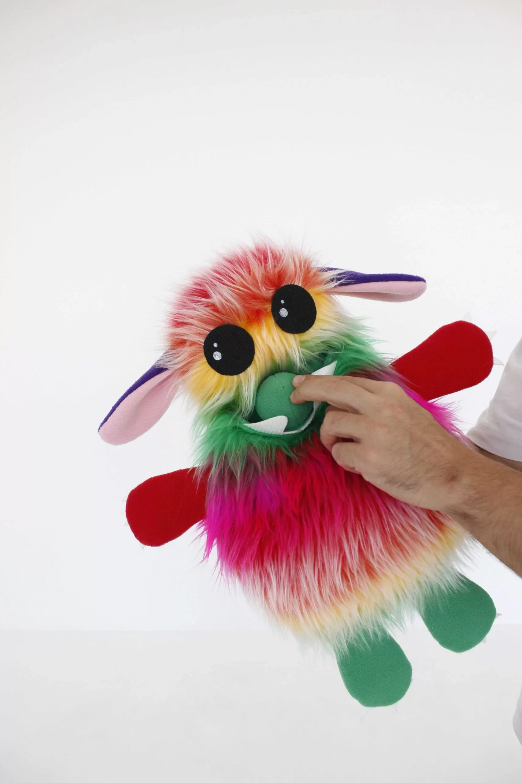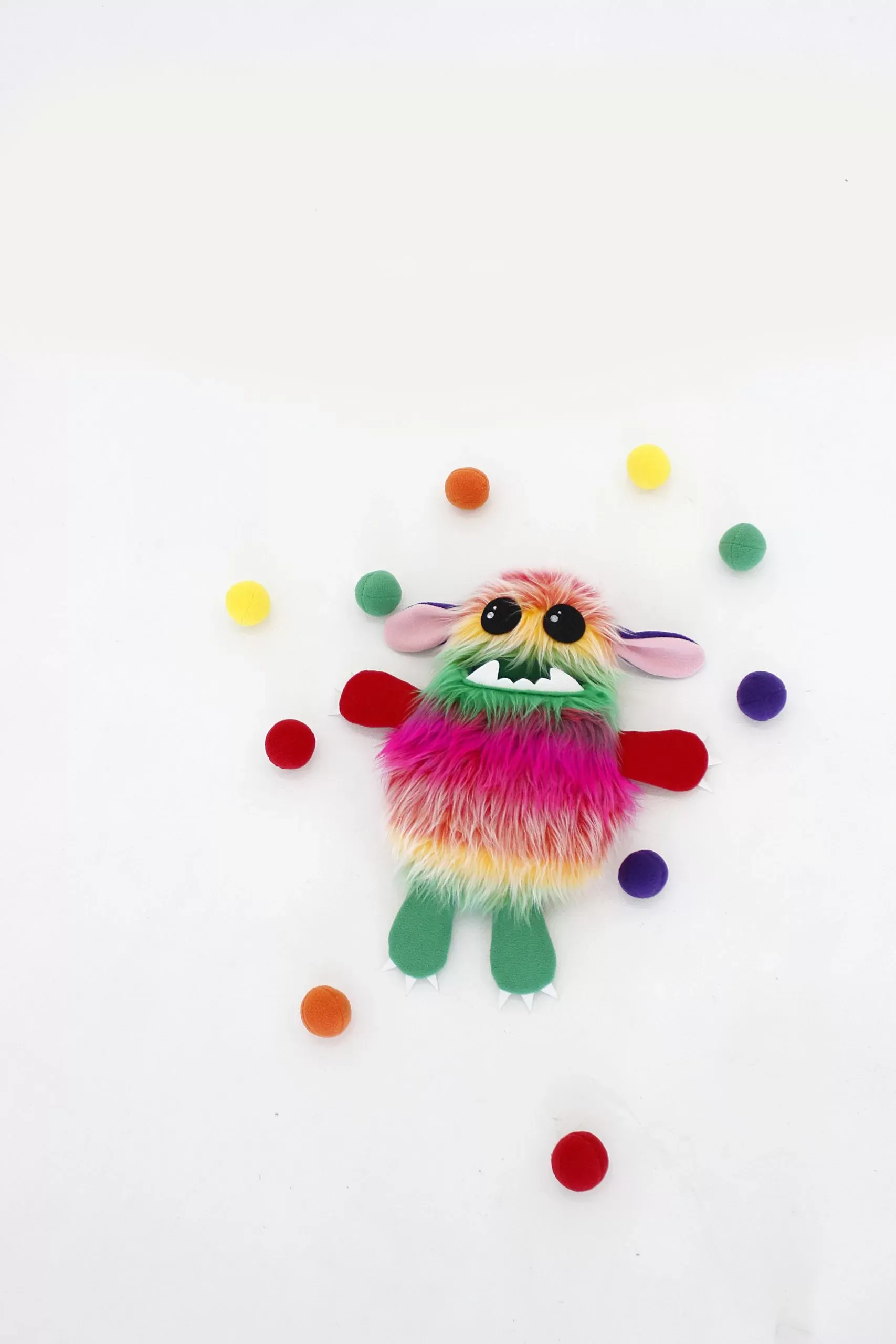 В животе у нашего забавного монстрика спрятан мешочек, в который и попадают шарики – поп-иты. Сделан он из разноцветного длинноворсового меха, лапки и ушки из мягкого флиса.