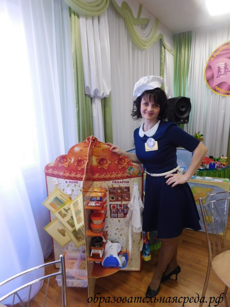 Пособие представлено в виде игровой 4-х створчатой ширмы. Каждый сегмент представлен для игровой деятельности детей (дидактической, сюжетно-ролевой) по темам: «полевые работы», «пекарня», «кондитерская», «магазин».