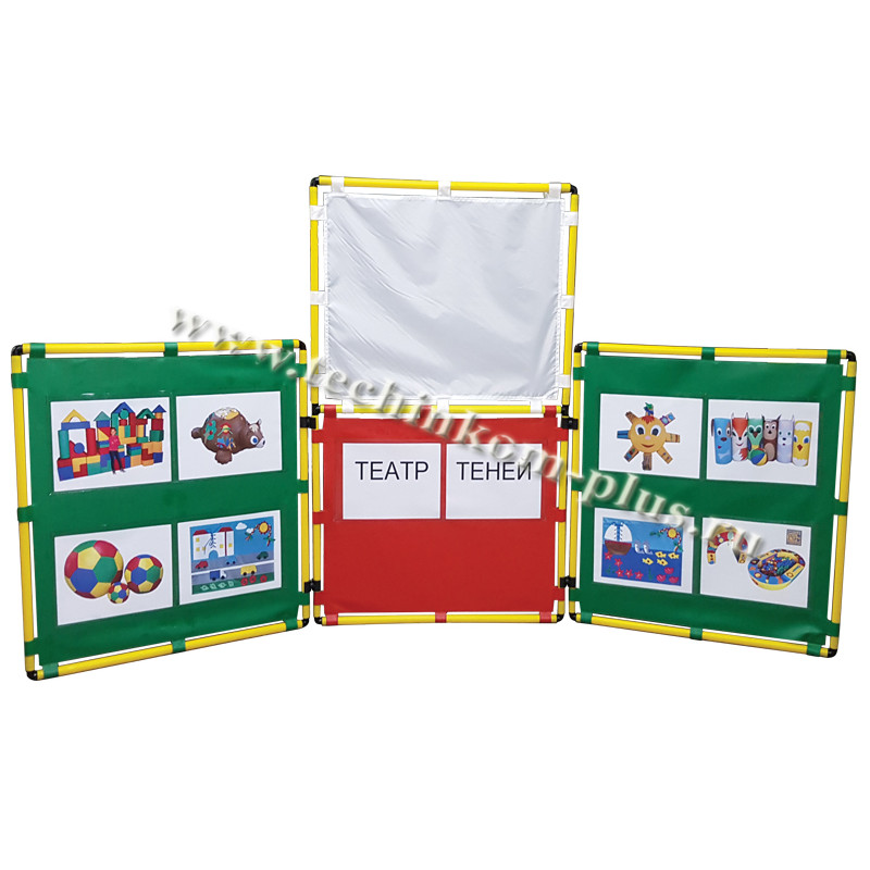 Ширма «Театртеней» имеет разборную конструкцию, благодаря чему занимаеточень мало место при хранении, легко транспортируется,а ткань секций можно снимать и стирать!