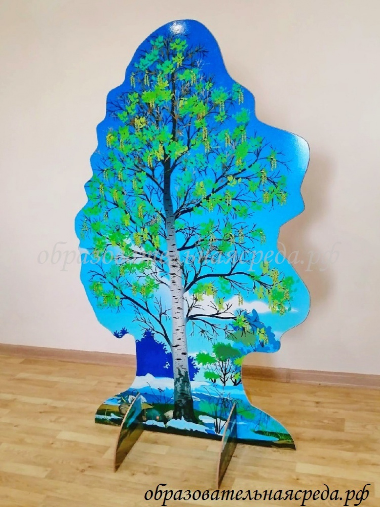 Театральная декорация "Береза" (весна-осень) выполнена из МДФ, с нанесением полноцветного рисунка с двух сторон. Высота декорации 1,6м, ширина - 1м.