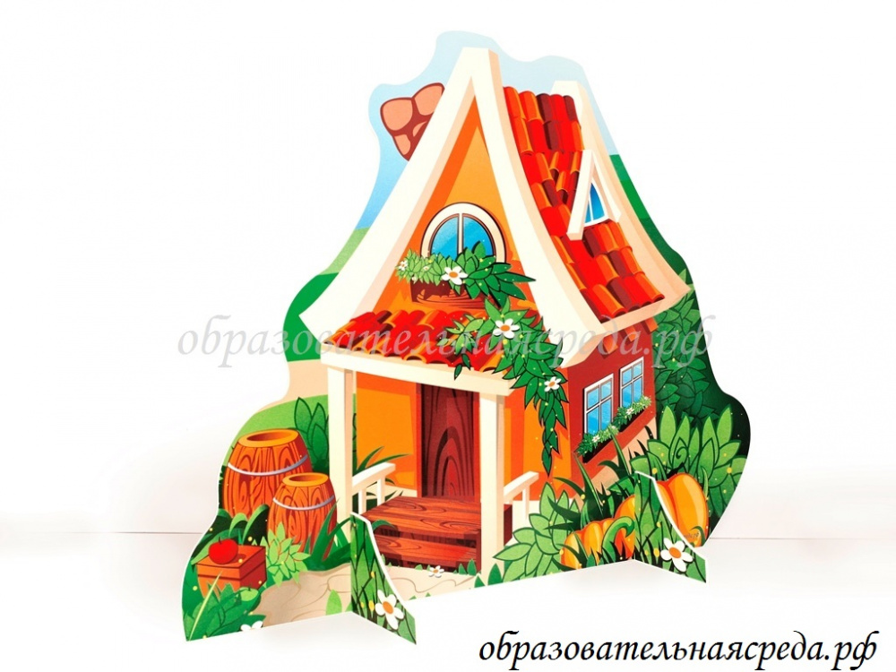 Театральная декорация "Домик с черепичной крышей" (лето-зима) выполнена из МДФ, с нанесением полноцветного рисунка с двух сторон. Высота декорации 1,2м, ширина - 1,5м.