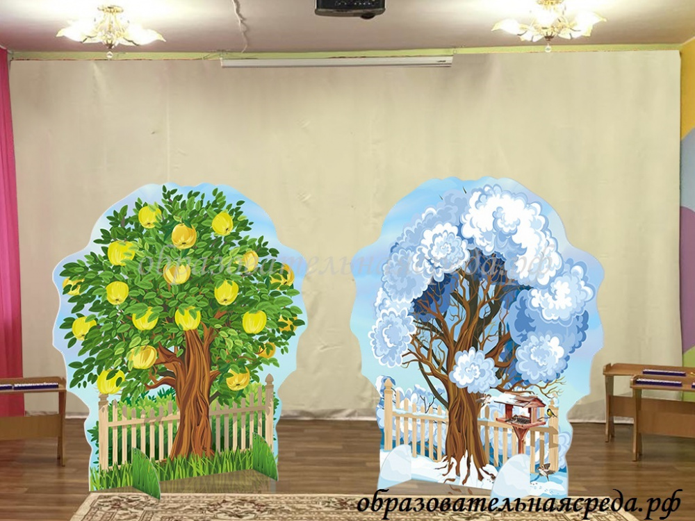 Театральная декорация "Яблоня садовая" (лето-зима) выполнена из МДФ, с нанесением полноцветного рисунка с двух сторон. Высота декорации 1,1м, ширина - 1м.