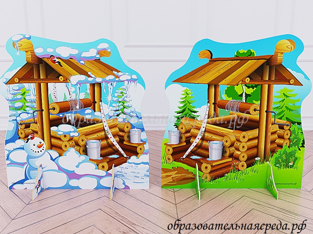 Театральная декорация "Колодец" (лето-зима) выполнена из МДФ, с нанесением полноцветного рисунка с двух сторон. Высота декорации 0,9м, ширина - 0,85м. Подножка 0,3*0,16м - 2шт.