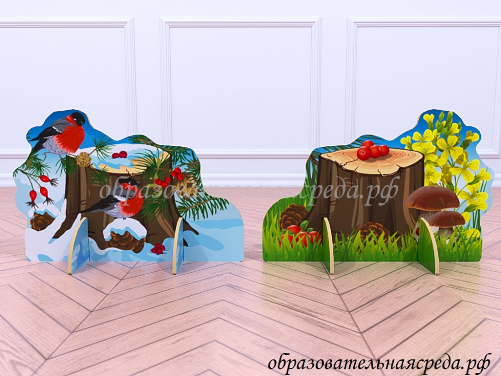 Театральная декорация "Пень с белыми грибами/ снегирями" (зима-осень) выполнена из МДФ, с нанесением полноцветного рисунка с двух сторон. Высота декорации 0,48м, ширина - 0,75м. Подножка: 0,25*0,112м - 2шт. Декорация подойдет в качестве дополнения к любому дереву или теремку, представленному у нас на сайте.