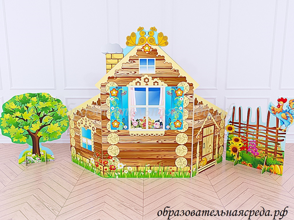 Театральная декорация "Русский дом" выполнена из МДФ, с нанесением полноцветного рисунка с двух сторон. Высота декорации 1,75м, общая длина 2,67м, ширина центральной створки 1,15м. Декорация "Русский дом" удачно впишется в постановку любой русско-народной сказки. В дополнение к дому можно приобрести другие двухсторонние декорации нашего производства.